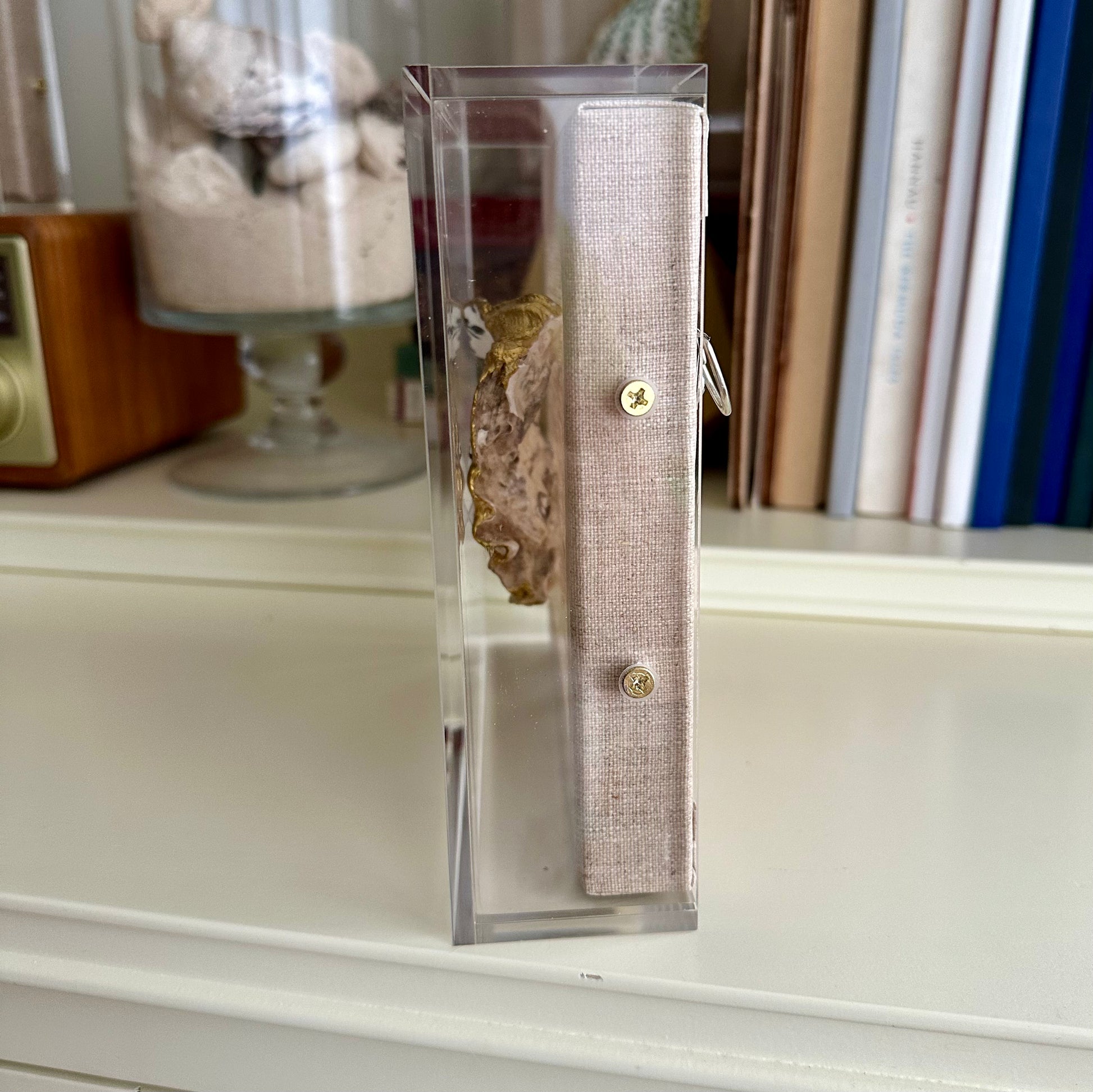 - 6x6”, 5-sided acrylic shadowbox lid (3/16" thick) with Linen canvas back.