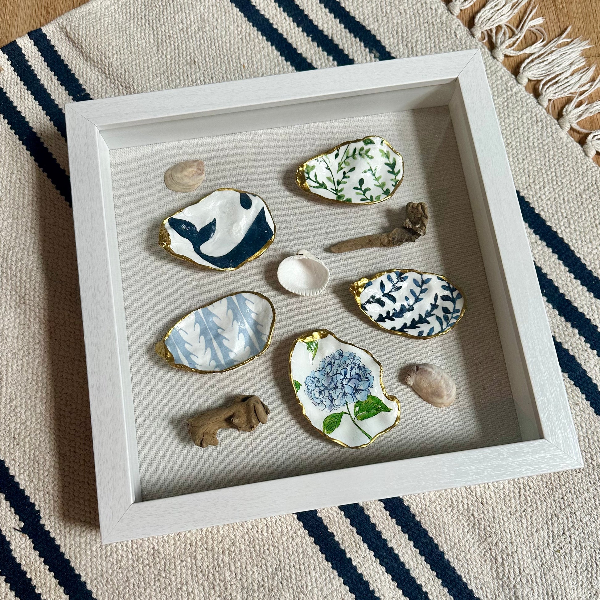 - 5 mounted handcrafted decoupage oyster shells with an eggshell finish and hand painted gold leaf trim, each measuring between 2-3” long. Additional perfectly petite intact natural shells and driftwoods round out the grouping. Every piece gathered from Cockle Cove Beach in Chatham, MA.